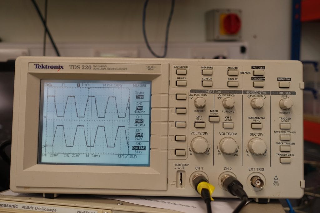 Please find a couple of photos showing this testing below. For these tests I only had a 52V VBST. Then I learned that adjusting R1 in the simplified schematic above changed the output voltage. Reading the data sheet always helps. I started out using an old-school ‘scope as I like them. Then switched to a new-school ‘scope because I could and nobody stopped me.