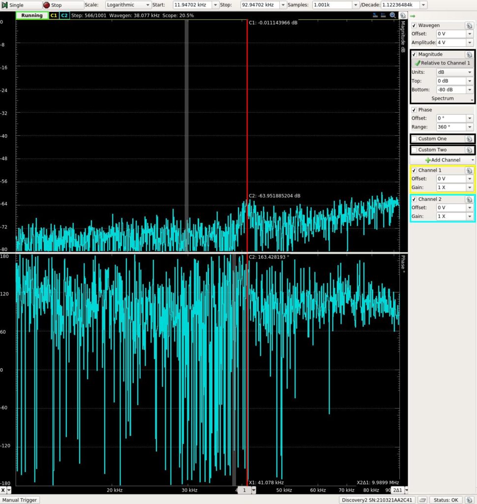 Network analyser output, red cursor at 40 kHz, top amplitude, bottom phase.