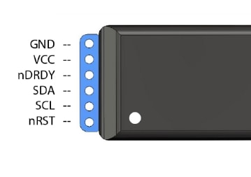 The wire colours that I used and their corresponding signals are: 1 black wire - GND ground 2 red wire - Vcc - 1.62-3.6V NOT 5V TOLERANT 3 green wire - nDRDY 4 blue wire - SDA - needs 10K pull up 5 yellow wire - SCL - needs 10K pull up 6 orange wire - nRST